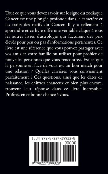 Tout ce que vous devez savoir sur le signe du zodiaque Cancer est une plongée profonde dans le caractère et les traits des natifs du Cancer. Il y a tellement à apprendre et ce livre offre une véritable claque à tous les autres livres d'astrologie qui facturent des prix élevés pour peu ou pas d'informations pertinentes. Ce livre est une référence que vous pouvez partager avec vos amis et votre famille ou utiliser pour profiler de nouvelles personnes que vous rencontrez. Est-ce que la personne en face de vous est un bon match pour une relation ? Quelles carrières vous conviennent parfaitement ? Ces questions, ainsi que les dates de naissance, les chiffres chanceux et bien plus encore, trouvent leur réponse dans ce livre incroyable. Profitez-en et bonne chance à vous.