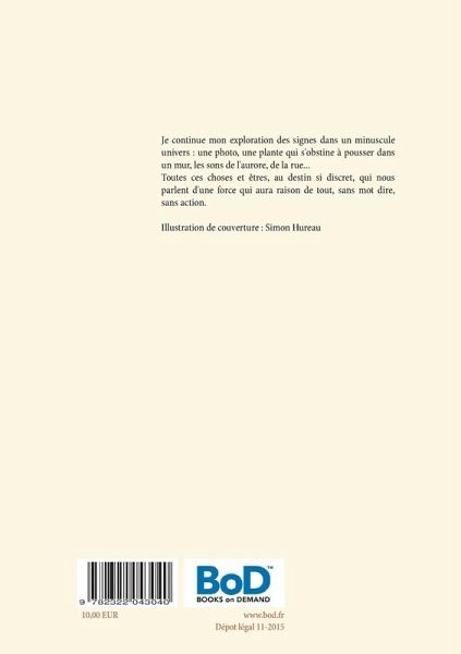 Je continue mon exploration des signes dans un minuscule univers : une photo, une plante qui s'obstine à pousser dans un mur, les sons de l'aurore, de la rue...Toutes ces choses et êtres, au destin si discret, qui nous parlent d'une force qui aura raison de tout, sans mot dire, sans action.Illustration de couverture : Simon Hureau