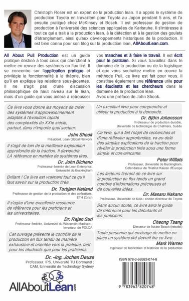 All About Pull Production est un guide pratique destiné à tous ceux qui cherchent à mettre en oeuvre des systèmes en flux tiré. Il se concentre sur l'application pratique et privilégie la fonctionnalité à la théorie, bien qu'il en explique les relations sous-jacentes. Il ne s'agit pas d'une discussion philosophique de haut niveau sur le lean, mais d'un guide qui vous aidera à retrousser vos manches et à faire le travail. Il est écrit pour le praticien. Si vous travaillez dans le domaine de la production ou de la logistique et que vous souhaitez mettre en oeuvre la méthode Pull, ce livre est fait pour vous. Il constitue également une référence utile pour les étudiants et les chercheurs dans le domaine de la production lean. Compliments pour Tout Sur La Production En Flux Tiré Vous trouverez dans ce livre de nombreuses techniques et outils qui vous aideront à reconfigurer les opérations de votre chaîne d'approvisionnement. Mais surtout, grâce à l'exploration de nombreuses approches et méthodes, ce livre vous incitera à repenser votre stratégie, à reconsidérer ce que votre système d'approvisionnement doit accomplir et pour quelles raisons. Ce livre vous donne les moyens de créer des systèmes d'approvisionnement adaptés à l'évolution rapide des complexités du 21e siècle, partout et dans tous les secteurs d'activité. John Shook Président, Lean Global Network Le professeur Roser est une source incontournable pour tout ce qui concerne le lean. Avec ce livre complet sur la production tirée, il a écrit un ouvrage qui fait autorité. Il est vivement recommandé à tous ceux qui souhaitent aller au coeur du principe de la production tirée de Toyota. Dr. Torbjørn Netland Professeur de gestion de la production et des opérations, ETH Zürich Conformément au principe lean Flow where you can, pull where you can't, Christoph Roser présente, de manière exhaustive en axant sur la pratique, les méthodes de contrôle de la production basées sur le principe de traction. Ce livre vaut la peine d'être lu par tous ceux qui sont confrontés au mura, c'est-à-dire à la variabilité des flux de valeur, et je le recommande aux étudiants et aux praticiens de l'industrie. Dr. -Ing. Jochen Deuse Professeur, chef de l'Institut des systèmes de production, Université TU Dortmund; directeur du Centre pour la fabrication avancée, Université de Technology Sydney Ce livre explique parfaitement la production en flux tiré dans un style excellent. Il démystifie définitivement la production en flux tiré. Sans nul doute, ce livre deviendra le guide de référence pour les débutants et les praticiens expérimentés. Cheong Tsang Directeur de l'usine Bosch (retraité) Le Prof. Dr Roser est un professionnel irremplaçable dans l'enseignement et l'étude des systèmes de gestion de production. Il possède à la fois un brillant talent académique, en tant que chercheur, et de riches compétences techniques en tant que praticien et consultant. Il possède en outre une longue expérience et de nombreuses connaissances tant en Europe qu'au Japon. Les lecteurs tireront certainement de son livre sur la production en flux tiré un grand nombre d'informations précieuses et de nouvelles idées. Dr. Masaru Nakano Professeur, Université de Keio; ancien directeur de Toyota