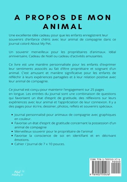 Une excellente idée cadeau pour que les enfants enregistrent leur d'enfance chéris avec leur animal de compagnie dans ce journal coloré À propos de mon animal de compagnie. Un souvenir merveilleux pour les propriétaires d'animaux. Idéal anniversaire, Cadeau de Noël ou cadeau Une excellente idée cadeau pour que les enfants enregistrent leur souvenirs. Enregistrer des souvenirs spéciaux avec leur animal de compagnie dans ce journal coloré À propos de mon animal de compagnie.d'activités amusantes. Ce livre est une manière personnalisée pour les enfants d'exprimer leur sentiments associés au fait d'être propriétaire et soignant d'un animal. C'est amusant et manière significative pour les enfants de réfléchir à leurs expériences partagées et à leur relation positive avec leur animal de compagnie. Ce journal est conçu pour maintenir l'engagement sur 25 pages en longue. Les entrées du journal sont une combinaison de questions qui favorisent un état d'esprit de gratitude, des réflexions sur leurs expériences avec leur animal et l'appréciation de leur connexion. Il y a des pages pour écrire, dessiner, photos, reflets et souvenirs spéciaux. - Journal personnalisé pour animaux de compagnie avec graphiques en couleur. - Favorise un état d'esprit de gratitude concernant la possession d'un animal de compagnie - Merveilleux souvenir pour le propriétaire de l'animal - Favorise la conscience de soi en identifiant et en décrivant émotions. - Cahier / Journal de 6,69 x 9,61 pouces.