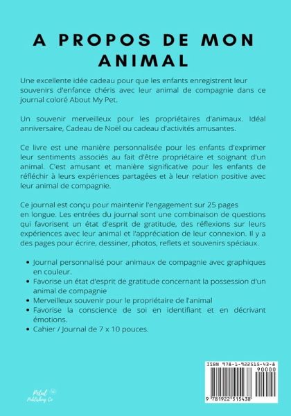 Une excellente idée cadeau pour que les enfants enregistrent leur d'enfance chéris avec leur animal de compagnie dans ce journal coloré À propos de mon animal de compagnie. Un souvenir merveilleux pour les propriétaires d'animaux. Idéal anniversaire, Cadeau de Noël ou cadeau Une excellente idée cadeau pour que les enfants enregistrent leur souvenirs. Enregistrer des souvenirs spéciaux avec leur animal de compagnie dans ce journal coloré À propos de mon animal de compagnie.d'activités amusantes. Ce livre est une manière personnalisée pour les enfants d'exprimer leur sentiments associés au fait d'être propriétaire et soignant d'un animal. C'est amusant et manière significative pour les enfants de réfléchir à leurs expériences partagées et à leur relation positive avec leur animal de compagnie. Ce journal est conçu pour maintenir l'engagement sur 25 pages en longue. Les entrées du journal sont une combinaison de questions qui favorisent un état d'esprit de gratitude, des réflexions sur leurs expériences avec leur animal et l'appréciation de leur connexion. Il y a des pages pour écrire, dessiner, photos, reflets et souvenirs spéciaux. - Journal personnalisé pour animaux de compagnie avec graphiques en couleur. - Favorise un état d'esprit de gratitude concernant la possession d'un animal de compagnie - Merveilleux souvenir pour le propriétaire de l'animal - Favorise la conscience de soi en identifiant et en décrivant émotions. - Cahier / Journal de 6,69 x 9,61 pouces.