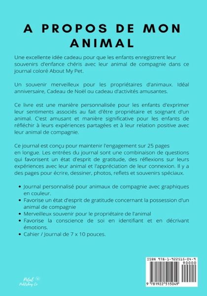 Une excellente idée cadeau pour que les enfants enregistrent leur d'enfance chéris avec leur animal de compagnie dans ce journal coloré À propos de mon animal de compagnie. Un souvenir merveilleux pour les propriétaires d'animaux. Idéal anniversaire, Cadeau de Noël ou cadeau Une excellente idée cadeau pour que les enfants enregistrent leur souvenirs. Enregistrer des souvenirs spéciaux avec leur animal de compagnie dans ce journal coloré À propos de mon animal de compagnie.d'activités amusantes. Ce livre est une manière personnalisée pour les enfants d'exprimer leur sentiments associés au fait d'être propriétaire et soignant d'un animal. C'est amusant et manière significative pour les enfants de réfléchir à leurs expériences partagées et à leur relation positive avec leur animal de compagnie. Ce journal est conçu pour maintenir l'engagement sur 25 pages en longue. Les entrées du journal sont une combinaison de questions qui favorisent un état d'esprit de gratitude, des réflexions sur leurs expériences avec leur animal et l'appréciation de leur connexion. Il y a des pages pour écrire, dessiner, photos, reflets et souvenirs spéciaux. - Journal personnalisé pour animaux de compagnie avec graphiques en couleur. - Favorise un état d'esprit de gratitude concernant la possession d'un animal de compagnie - Merveilleux souvenir pour le propriétaire de l'animal - Favorise la conscience de soi en identifiant et en décrivant émotions. - Cahier / Journal de 6,69 x 9,61 pouces.