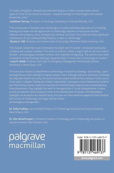 This book puts forward a comprehensive criminology of disaster by drawing - and building - upon existing theories which attempt to explain disaster crime. Although antisocial behaviour in disasters has long been viewed as a rarity, the authors present ample evidence that a variety of crime occurs in the wake of disaster. Frailing and Harper's explorations of property crime, interpersonal violence and fraud during disaster reveal the importance of methodological approaches to understanding these phenomena. They highlight the need for the application of social disorganization, routine activity and general strain theories of crime in the development of disaster crime prevention strategies. An accessible and detailed study, this book will have particular appeal for both students and scholars of criminology, sociology, disaster studies and emergency management.