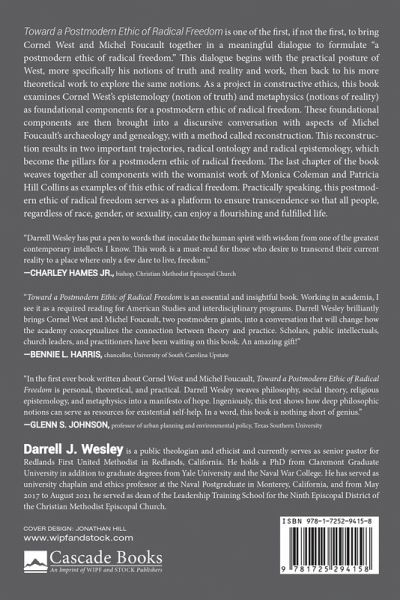 Toward a Postmodern Ethic of Radical Freedom is one of the first, if not the first, to bring Cornel West and Michel Foucault together in a meaningful dialogue to formulate "a postmodern ethic of radical freedom." This dialogue begins with the practical posture of West, more specifically his notions of truth and reality and work, then goes back to his more theoretical work to explore the same notions. As a project in constructive ethics, this book examines Cornel West's epistemology (notion of truth) and metaphysics (notions of reality) as foundational components for a postmodern ethic of radical freedom. These foundational components are then brought into a discursive conversation with aspects of Michel Foucault's archaeology and genealogy, with a method called reconstruction. This reconstruction results in two important trajectories, radical ontology and radical epistemology, which become the pillars for a postmodern ethic of radical freedom. The last chapter of the book weaves together all components with the womanist work of Monica Coleman and Patricia Hill Collins as examples of this ethic of radical freedom. Practically speaking, this postmodern ethic of radical freedom serves as a platform to ensure transcendence so that all people, regardless of race, gender, or sexuality, can enjoy a flourishing and fulfilled life.
