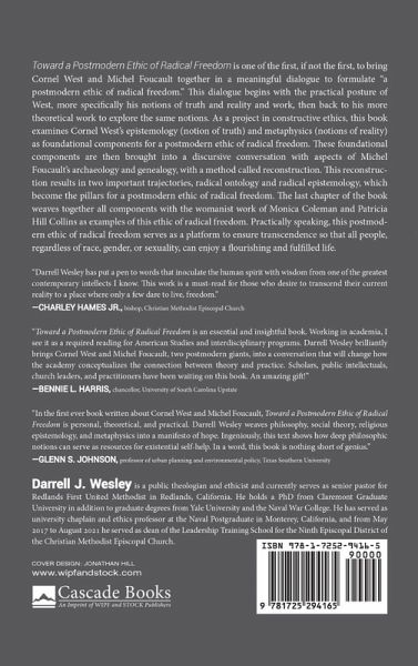 Toward a Postmodern Ethic of Radical Freedom is one of the first, if not the first, to bring Cornel West and Michel Foucault together in a meaningful dialogue to formulate "a postmodern ethic of radical freedom." This dialogue begins with the practical posture of West, more specifically his notions of truth and reality and work, then goes back to his more theoretical work to explore the same notions. As a project in constructive ethics, this book examines Cornel West's epistemology (notion of truth) and metaphysics (notions of reality) as foundational components for a postmodern ethic of radical freedom. These foundational components are then brought into a discursive conversation with aspects of Michel Foucault's archaeology and genealogy, with a method called reconstruction. This reconstruction results in two important trajectories, radical ontology and radical epistemology, which become the pillars for a postmodern ethic of radical freedom. The last chapter of the book weaves together all components with the womanist work of Monica Coleman and Patricia Hill Collins as examples of this ethic of radical freedom. Practically speaking, this postmodern ethic of radical freedom serves as a platform to ensure transcendence so that all people, regardless of race, gender, or sexuality, can enjoy a flourishing and fulfilled life.
