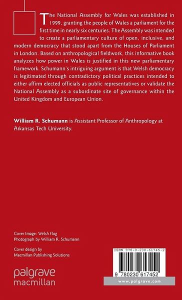 The National Assembly for Wales was established in 1999, granting the people of Wales a parliament for the first time in nearly six centuries. The Assembly was intended to create a parliamentary culture of open, inclusive, and modern democracy that stood apart from the Houses of Parliament in London. Based on anthropological fieldwork, this informative book analyzes how power in Wales is legitimated and justified. William Schumann s intriguing argument makes the case that contradictory political practices exist which affirm elected officials as public representatives while also reproducing the subordinate status of Wales within the institutional hierarchies of the United Kingdom and European Union.