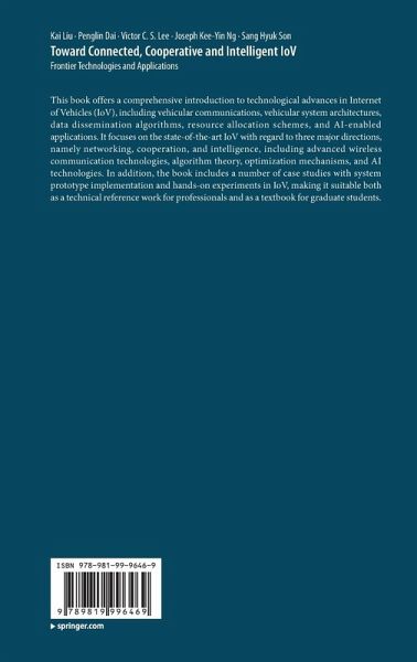 Part I. Introduction.- Chapter 1. Background of IoV.- Chapter 2. State-of-the-Art.- Part II. Connected IoV: Vehicular Communications and Data Dissemination.- Chapter 3. Data Dissemination via I2V/V2V Communications in Software Defined Vehicular Networks.- Chapter 4. Network Coding Assisted Data Broadcast in Large-Scale Vehicular Networks.- Chapter 5. Fog Computing Empowered Data Dissemination in Heterogeneous Vehicular Networks.- Chapter 6. Temporal Data Uploading and Dissemination in Real-time Vehicular Networks.- Part III Cooperative IoV: End-Edge-Cloud Cooperative Scheduling and Optimization.- Chapter 7. Convex Optimization on Vehicular End-Edge-Cloud Cooperative Task Offloading.- Chapter 8. An Approximation Algorithm for Joint Data Uploading and Task Offloading in IoV.- Chapter 9. Distributed Task Offloading and Workload Balancing in IoV.- Part IV. Intelligent IoV: Key Enabling Technologies in Vehicular Edge Intelligence.- Chapter 10. Toward Timely and Reliable DNN Inference in Vehicular Edge Intelligence.- Chapter 11. Deep Q-learning based Adaptive Multimedia Streaming in Vehicular Edge Intelligence.- Chapter 12. A Multi-agent Multi-objective Deep Reinforcement Learning Solution for Digital Twin in Vehicular Edge Intelligence.- Part V. Case Studies.- Chapter 13. See Through System.- Chapter 14. Non-Line-of-Sight Collision Warning System.- Chapter 15. Proactive Traffic Abnormity Warning System.- Chapter 16. UAV-assisted Pedestrian Detection System.- Chapter 17. Vehicular Indoor Localization and Tracking System.- Part VI. Conclusion and Future Directions.- Chapter 18. Conclusion .- Chapter 19. Future Directions.