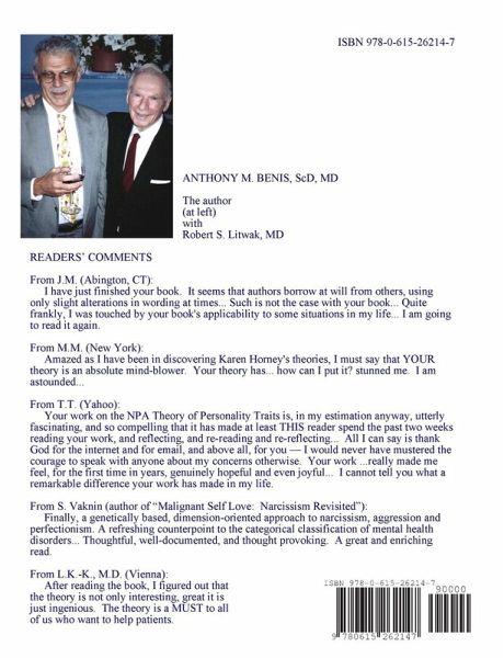 by Anthony M. Benis, Sc.D., M.D. This is a paperback Second Edition of the version published in 1985 by Psychological Dimensions Press, updated to 2008. It is the original version of the NPA personality theory derived from the ideas of Karen Horney. The NPA traits, posited to be of genetic origins, are narcissism, perfectionism and aggression. The text is written in question-and-answer (Q & A) format. Book properties: Oversize paperback (7.4" x 9.7"), 521 pages, 19 figures, 7 tables, 48 plates, glossary, addendum, index. Glossy cover: the front and back covers may be seen [here]. ISBN 978-0-615-26214-7