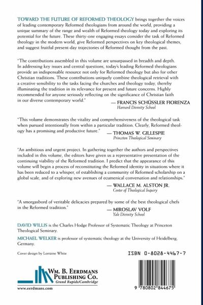 This is a print on demand book and is therefore non- returnable. Toward the Future of Reformed Theology brings together the voices of leading contemporary Reformed theologians from around the world, providing a unique summary of the range and wealth of Reformed theology today and exploring its potential for the future. These thirty-one essays consider the task of Reformed theology in the modern world, give Reformed perspectives on key theological themes, and suggest fruitful present-day trajectories of Reformed thought from the past. Contributors: Brian GerrishM Janos Pasztor Nobuo Watanabe Choan-Seng Song Edmund Za Bik Wafiq Wahba John de Gruchy Jürgen Moltmann Michael Welker Beatriz Melano Thomas Torrance David Willis William Placher Alexander McKelway Leanne Van Dyk Christian Link Lukas Vischer Walter Herrenbrück Nancy Duff Hans-Joachim Kraus John Leith Willem Balke Hans- Helmut Esser Dawn DeVries Jan Milic Lochman John Hesselink Sang Hyun Lee Amy Plantinga Pauw Bruce McCormack Daniel Migliore Eberhard Busch