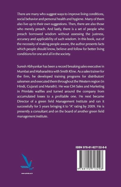There are many who suggest ways to improve living conditions, social behavior and personal health and hygiene. Many of them also live up to their own suggestions. Then, there are also those who merely preach. And lastly, there is a set of people who preached borrowed wisdom without assessing the justness, accuracy and applicability of such wisdom. In this book, out of the necessity of making people aware, the author presents facts which people should know, believe and follow for better living conditions for one and all in the society.