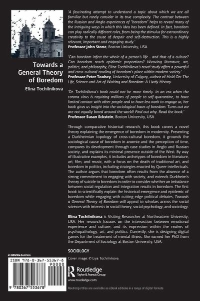 Through comparative historical research, this book offers a novel theory explaining the emergence of boredom in modernity. Presenting a Durkheimian topology of cross-cultural boredom, it grounds the sociological cause of boredom in anomie and the perception of time, compares its development through case studies in Anglo and Russian society, and explains its minimal presence outside of the West. By way of illustrative examples, it includes archetypes of boredom in literature, art, film, and music, with a focus on the death of traditional art, and boredom in politics, including strategies enacted by Queer intellectuals. The author argues that boredom often results from the absence of a strong commitment to engaging with society, and extends Durkheim's theory of suicide to boredom in order to consider whether an imbalance between social regulation and integration results in boredom. The first book to scientifically explain the historical emergence and epidemic of boredom while engaging with cutting edge political debates, Towards a General Theory of Boredom will appeal to scholars across the social sciences with interests in social theory, social psychology, and sociology.