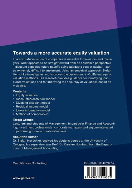 The accurate valuation of companies is essential for investors and managers. What appears to be straightforward from an academic perspective - discount expected future payoffs using adequate cost of capital - can be extremely difficult to implement. Using an empirical approach, Stefan Henschke investigates and improves the performance of different equity valuation methods. His research provides guidance for identifying inaccurate valuations and for improving the accuracy of valuations based on multiples.