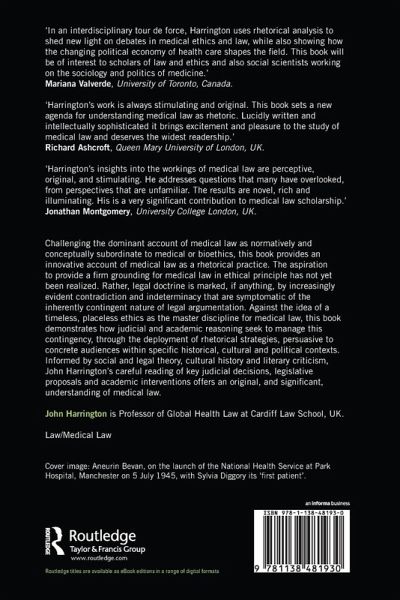 Challenging the dominant account of medical law as normatively and conceptually subordinate to medical or bioethics, this book provides an innovative account of medical law as a rhetorical practice. The aspiration to provide a firm grounding for medical law in ethical principle has not yet been realized. Rather, legal doctrine is marked, if anything, by increasingly evident contradiction and indeterminacy that are symptomatic of the inherently contingent nature of legal argumentation. Against the idea of a timeless, placeless ethics as the master discipline for medical law, this book demonstrates how judicial and academic reasoning seek to manage this contingency, through the deployment of rhetorical strategies, persuasive to concrete audiences within specific historical, cultural and political contexts. Informed by social and legal theory, cultural history and literary criticism, John Harrington's careful reading of key judicial decisions, legislative proposals and academic interventions offers an original, and significant, understanding of medical law.