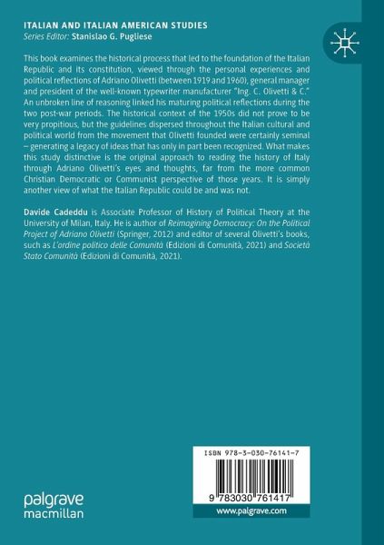 This book examines the historical process that led to the foundation of the Italian Republic and its constitution, viewed through the personal experiences and political reflections of Adriano Olivetti (between 1919 and 1960), general manager and president of the well-known typewriter manufacturer "Ing. C. Olivetti & C." An unbroken line of reasoning linked his maturing political reflections during the two post-war periods. The historical context of the 1950s did not prove to be very propitious, but the guidelines dispersed throughout the Italian cultural and political world from the movement that Olivetti founded were certainly seminal - generating a legacy of ideas that has only in part been recognized. What makes this study distinctive is the original approach to reading the history of Italy through Adriano Olivetti's eyes and thoughts, far from the more common Christian Democratic or Communist perspective of those years. It is simply another view of what the Italian Republiccould be and was not.