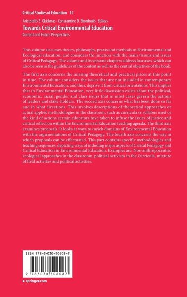 The first axis concerns the missing theoretical and practical pieces at this point in time. The volume considers the issues that are not included in contemporary Environmental Education, and thus, deprive it from critical orientations. This implies that in Environmental Education, very little discussion exists about the political, economic, racial, gender and class issues that in most cases govern the actions of leaders and stake-holders. The second axis concerns what has been done so far and in what directions. This involves descriptions of theoretical approaches or actual applied methodologies in the classroom, such as curriculaor syllabus used or the kind of actions certain educators have taken to infuse the issues of justice and critical reflection within the Environmental Education teaching agenda. The third axis examines proposals. It looks at ways to enrich domains of Environmental Education with the argumentations of Critical Pedagogy. The fourth axis concerns the way in which proposals can be effectuated. This part contains specific methodologies and teaching sequences, depicting ways of including major aspects of Critical Pedagogy and Critical Education in Environmental Education. Examples are: Non-anthropocentric ecological approaches in the classroom, political activism in the Curricula, mixture of field activities and political activities.
