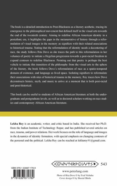 The book is a detailed introduction to Post-Blackness as a literary aesthetic, tracing its emergence to the philosophical movement that defined itself in the visual arts towards the end of the twentieth century. Aiming to redefine African American identity in a postethnic era, it highlights the gaps in the metanarrative of history through a reformulation of visual images in the memory as signifiers with their related associations to historical trauma. Stating that the reformulation of identity needs a decentering of race, the study follows Rita Dove as she traces the path to this reformulation in her volumes of poetry to initiate a Hegelian progression towards a post-racial freedom to expand contours to redefine Blackness. Pointing out that poetry is perhaps the best vehicle to initiate this transition of the philosophy from the visual arts to the sphere of the literary, the book follows Dove's reformulation of race as a spatio-temporal domain of existence, and language as lived space. Isolating signifiers to reformulate their associations with sites of historical trauma in the memory, Roy traces how Dove deconstructs history, myth, and music to arrive at a moment that is both post-racial and post-historical.