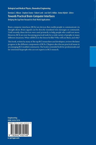 This book, written by many of the top BCI researchers and developers, reviews the latest progress in the different components of BCIs. Chapters also discuss practical issues in an emerging BCI enabled community. The book is intended both for professionals and for interested laypeople who are not experts in BCI research.