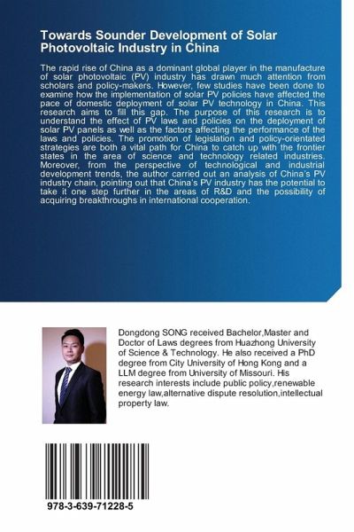 The rapid rise of China as a dominant global player in the manufacture of solar photovoltaic (PV) industry has drawn much attention from scholars and policy-makers. However, few studies have been done to examine how the implementation of solar PV policies have affected the pace of domestic deployment of solar PV technology in China. This research aims to fill this gap. The purpose of this research is to understand the effect of PV laws and policies on the deployment of solar PV panels as well as the factors affecting the performance of the laws and policies. The promotion of legislation and policy-orientated strategies are both a vital path for China to catch up with the frontier states in the area of science and technology related industries. Moreover, from the perspective of technological and industrial development trends, the author carried out an analysis of China s PV industry chain, pointing out that China s PV industry has the potential to take it one step further in the areas of R&D and the possibility of acquiring breakthroughs in international cooperation.