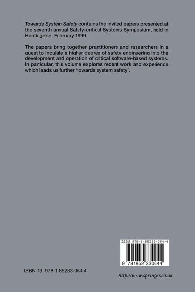 Each year the Safety-critical Systems Symposium brings together practitioners and researchers in a quest to inculcate a higher degree of safety engineering into the development and operation of critical software-based systems. On this, the Symposium's seventh occasion, it explores recent work and experience which lead us further 'towards system safety'. This book of the Proceedings covers the entire event. The first paper is the course text of a tutorial run on the first day of the Symposium, included here to provide readers with a coverage of the entire event. The next fourteen papers were presented, on the second and third days, in six sessions: Safety Cases, Systems Engineering, Safety Analysis and Safety Integrity, Tools for Software Safety, Solving Safety Problems, and Qllestions and Competences. Eight of the fourteen papers were authored in industry, four in universities, and two in other research establishments. Four of them report on work outside the UK: in France, Germany, Norway and Brazil. There are three papers on safety cases, each taking a different perspective. Skogstad from Norway and Boyce and Hamilton of GEC-Marconi both report on experience in the field, the former in attempting to apply European norms to project documentation and the latter in attempting to build up a retrospective safety case. The third paper, by Goodman, takes a more philosophical stance, examining the lack of useful measurement in safety assurance.