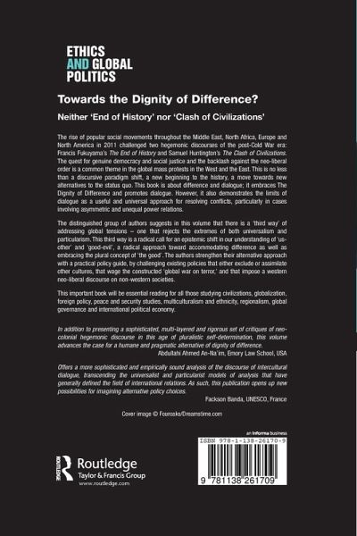 The rise of popular social movements throughout the Middle East, North Africa, Europe and North America in 2011 challenged two hegemonic discourses of the post-Cold War era: Francis Fukuyama's 'The End of History' and Samuel Huntington's 'The Clash of Civilizations.' The quest for genuine democracy and social justice and the backlash against the neoliberal order is a common theme in the global mass protests in the West and the East. This is no less than a discursive paradigm shift, a new beginning to the history, a move towards new alternatives to the status quo. This book is about difference and dialogue; it embraces The Dignity of Difference and promotes dialogue. However, it also demonstrates the limits of dialogue as a useful and universal approach for resolving conflicts, particularly in cases involving asymmetric and unequal power relations. The distinguished group of authors suggests in this volume that there is a 'third way' of addressing global tensions - one that rejects the extremes of both universalism and particularism. This third way is a radical call for an epistemic shift in our understanding of 'us-other' and 'good-evil', a radical approach toward accommodating difference as well as embracing the plural concept of 'the good'. The authors strengthen their alternative approach with a practical policy guide, by challenging existing policies that either exclude or assimilate other cultures, that wage the constructed 'global war on terror,' and that impose a western neo-liberal discourse on non-western societies. This important book will be essential reading for all those studying civilizations, globalization, foreign policy, peace and security studies, multiculturalism and ethnicity, regionalism, global governance and international political economy.