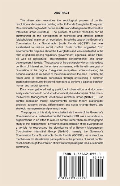This dissertation examines the sociological process of conflict resolution and consensus building in South Florida Everglades Ecosystem Restoration through what I define as a Network Management Coordinative Interstitial Group (NetMIG). The process of conflict resolution can be summarized as the participation of interested and affected parties (stakeholders) in a forum of negotiation. I study the case of the Governor's Commission for a Sustainable South Florida (GCSSF) that was established to reduce social conflict. Such conflict originated from environmental disputes about the Everglades and was manifested in the form of gridlock among regulatory (government) agencies, Indian tribes, as well as agricultural, environmental conservationist and urban development interests. The purpose of the participatory forum is to reduce conflicts of interest and to achieve consensus, with the ultimate goal of restoration of the original Everglades ecosystem, while cultivating the economic and cultural bases of the communities in the area. Further, the forum aims to formulate consensus through envisioning a common sustainable community by providing means to achieve a balance between human and natural systems. Data were gathered using participant observation and document analysis techniques to conduct a theoretically based analysis of the role of the Network Management Coordinative Interstitial Group (NetMIG). I use conflict resolution theory, environmental conflict theory, stakeholder analysis, systems theory, differentiation and social change theory, and strategic management and planning theory. The purpose of this study is to substantiate the role of the Governor's Commission for a Sustainable South Florida (GCSSF) as a consortium of organizations in an effort to resolve conflict rather than an ethnographic study of this organization. Environmental restoration of the Everglades is a vehicle for recognizing the significance of a Network Management Coordinative Interstitial Group (NetMIG), namely the Governor's Commission for a Sustainable South Florida (GCSSF), as a structural mechanism for stakeholder participation in the process of social conflict resolution through the creation of new cultural paradigms for a sustainable community.