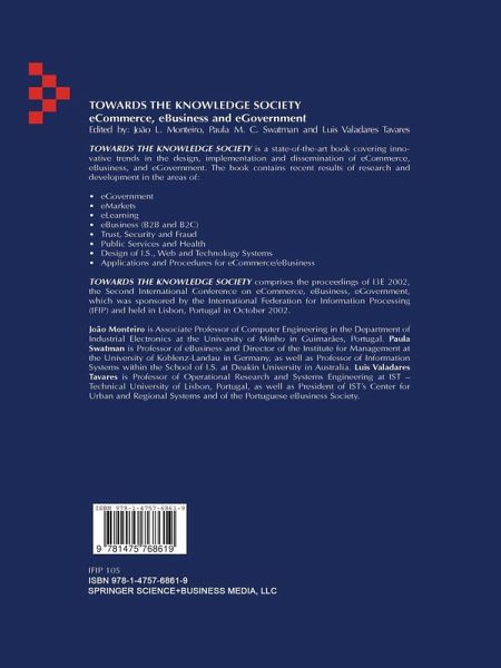 João Monteiro is Associate Professor of Computer Engineering in the Department of Industrial Electronics at the University of Minho in Guimaräes, Portugal. Paula Swatman is Professor of eBusiness and Director of the Institute for Management at the University of Koblenz-Landau in Germany, as well as Professor of Information Systems within the School of I.S. at Deakin University in Australia. Luis Valadares Tavares is Professor of Operational Research and Systems Engineering at IST - Technical University of Lisbon, Portugal, as well as President of IST's Center for Urban and Regional Systems and of the Portuguese eBusiness Society.