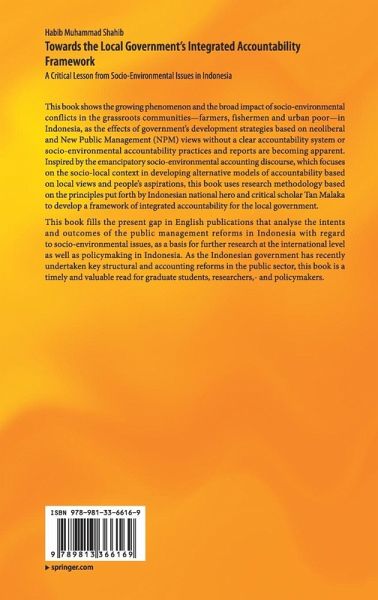 This book shows the growing phenomenon and the broad impact of socio-environmental conflicts in the grassroots communities-farmers, fishermen and urban poor-in Indonesia, as the effects of government's development strategies based on neoliberal and New Public Management (NPM) views without a clear accountability system or socio-environmental accountability practices and reports are becoming apparent. Inspired by the emancipatory socio-environmental accounting discourse, which focuses on the socio-local context in developing alternative models of accountability based on local views and people's aspirations, this book uses research methodology based on the principles put forth by Indonesian national hero and critical scholar Tan Malaka to develop a framework of integrated accountability for the local government.