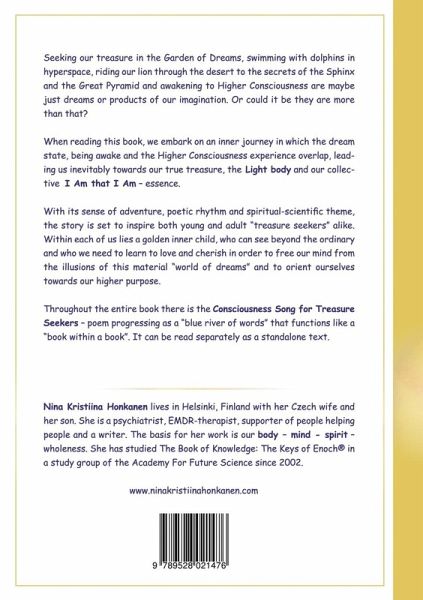 Seeking our treasure in the Garden of Dreams, swimming with dolphins in hyperspace, riding our lion through the desert to the secrets of the Sphinx and the Great Pyramid and awakening to Higher Consciousness are maybe just dreams or products of our imagination. Or could it be they are more than that?When reading this book, we embark on an inner journey in which the dream state, being awake and the Higher Consciousness experience overlap, leading us inevitably towards our true treasure, the Light body and our collective I Am that I Am - essence.With its sense of adventure, poetic rhythm and spiritual-scientific theme, the story is set to inspire both young and adult "treasure seekers" alike. Within each of us lies a golden inner child, who can see beyond the ordinary and who we need to learn to love and cherish in order to free our mind from the illusions of this material "world of dreams" and to orient ourselves towards our higher purpose.Throughout the entire book there is the Consciousness Song for Treasure Seekers - poem progressing as a "blue river of words" that functions like a "book within a book". It can be read separately as a standalone text.