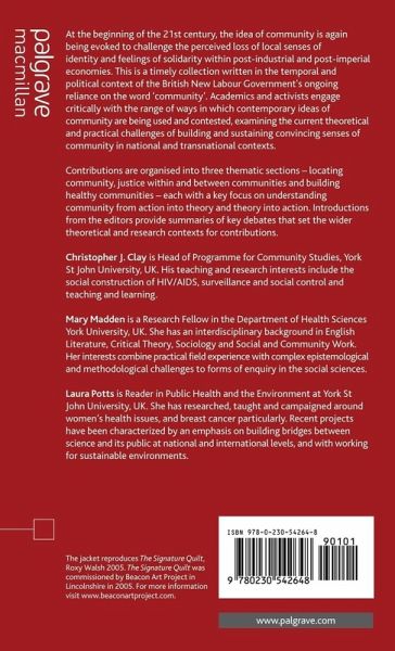 Notes on Contributors Towards Understanding Community - an introduction; C.J.Clay, M.Madden & L.Potts The Signature Quilt; R.Walsh PART 1: LOCATING COMMUNITY Locating Community: An Introduction; C.J.Clay The Politics of Community: New Labour and the Eclipse of Society; S.Parker Learning Communities and Tertiary Education; S.Billingham 'For All the Women Out There': Community and the Ethics of Care in the Marketing of a Breast Cancer Fundraising Event; J.D'Aloisio Contingent Communities: British Social Policy and the Invention of Refugee Communities; L.Kelly PART 2: JUSTICE WITHIN AND BETWEEN COMMUNITIES Justice Within and Between Communities: An Introduction; M.Madden Globalisation, Multiple Threats and the Weakness of International Institutions: A Community-Centred Response; S.Sweeney The Ideal of a Sustainable Community, 2006; K.Peat Community Informatics: Building Civil Society in the Information Age?; L.Keeble Working with the Community: Research and Action; G.Letherby i mpet us , a Movement Towards Shared Ethical Values and Human Rights; A.Short PART 3: BUILDING HEALTHY COMMUNITIES Building Healthy Communities: An Introduction; L.Potts How Communities Can Use Geographical Information Systems; S.Cinderby Community Capacity Building, Community Development and Health: A Case Study of 'Health Issues in the Community'; R.Phillips A Community of Expertise: Positioning the UK Environmental Breast Cancer Movement; L.Potts Promoting Participatory Working; P.Turton Bibliography Index