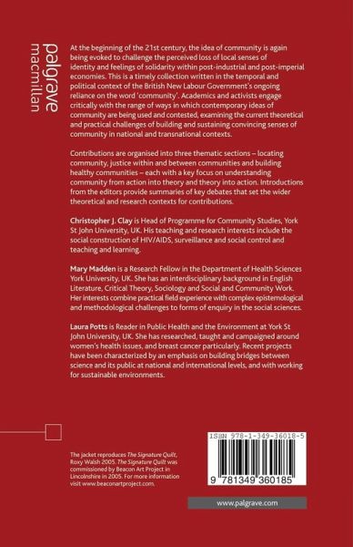 Notes on Contributors Towards Understanding Community - an introduction; C.J.Clay, M.Madden & L.Potts The Signature Quilt; R.Walsh PART 1: LOCATING COMMUNITY Locating Community: An Introduction; C.J.Clay The Politics of Community: New Labour and the Eclipse of Society; S.Parker Learning Communities and Tertiary Education; S.Billingham 'For All the Women Out There': Community and the Ethics of Care in the Marketing of a Breast Cancer Fundraising Event; J.D'Aloisio Contingent Communities: British Social Policy and the Invention of Refugee Communities; L.Kelly PART 2: JUSTICE WITHIN AND BETWEEN COMMUNITIES Justice Within and Between Communities: An Introduction; M.Madden Globalisation, Multiple Threats and the Weakness of International Institutions: A Community-Centred Response; S.Sweeney The Ideal of a Sustainable Community, 2006; K.Peat Community Informatics: Building Civil Society in the Information Age?; L.Keeble Working with the Community: Research and Action; G.Letherby i mpet us , a Movement Towards Shared Ethical Values and Human Rights; A.Short PART 3: BUILDING HEALTHY COMMUNITIES Building Healthy Communities: An Introduction; L.Potts How Communities Can Use Geographical Information Systems; S.Cinderby Community Capacity Building, Community Development and Health: A Case Study of 'Health Issues in the Community'; R.Phillips A Community of Expertise: Positioning the UK Environmental Breast Cancer Movement; L.Potts Promoting Participatory Working; P.Turton Bibliography Index