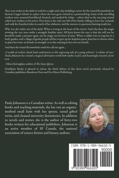 They were stolen in the dark to work for a night and a day, building a tower for the wizard Krummholz on faraway Copper Island, in a place where the trees grow twisted in a poisoned bog. Some of the unwilling workers were returned bewildered, bruised, and marked by whips -- others died as the uncaring wizard called new workers to his tower. Now Jenia is the only one left of her family willing to leave her orchards and walk five hundred miles in search of her abductor, and the answers to questions burning inside her. Why was she stolen out of the dark? What is wrong at the heart of the tower? And why does the magic twisting the very trees strike a strangely familiar note? All Jenia knows for sure is that she will not let herself be made a prisoner again, not by magic nor by force of arms. When a soldier tries to trap her in a lord's garden, and a village of gentle people tell her to give up her hopeless quest, Jenia has to choose where to place her trust: in friends, in strength, or in the cunning in her own two hands. And then the wizard Krummholz sends his call out again... A wealth of realistic detail lends authenticity to this engrossing tale of a young arborist, "a scholar of trees." Paula Johanson has created a magical alternative world both mythic in feel, and hauntingly evocative of our own. - Eileen Kernaghan, author of The Snow Queen. Doublejoy Books is pleased to release the third edition of this short novel, previously released by Canadian publishers Bundoran Press and Five Rivers Publishing.