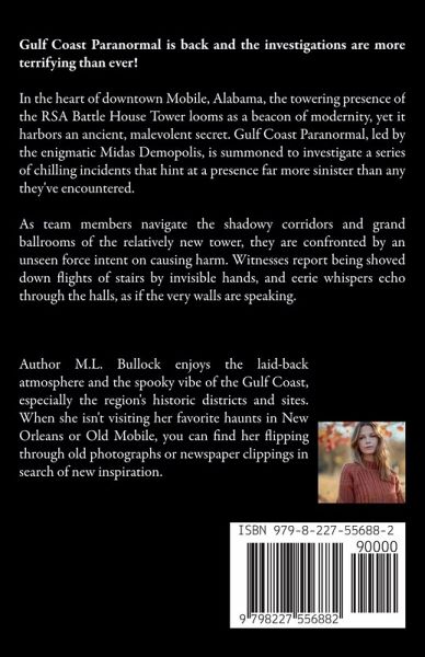 Gulf Coast Paranormal is back and the investigations are more terrifying than ever! In the heart of downtown Mobile, Alabama, the towering presence of the RSA Battle House Tower looms as a beacon of modernity, yet it harbors an ancient, malevolent secret. Gulf Coast Paranormal, led by the enigmatic Midas Demopolis, is summoned to investigate a series of chilling incidents that hint at a presence far more sinister than any they've encountered. As team members navigate the shadowy corridors and grand ballrooms of the relatively new tower, they are confronted by an unseen force intent on causing harm. Witnesses report being shoved down flights of stairs by invisible hands, and eerie whispers echo through the halls, as if the very walls are speaking. Amidst the high-tech ghost hunting gear and time-tested paranormal theories, Midas and his team delve deeper into the building's past, uncovering hidden stories etched into its foundations. As they piece together the haunting's origins of the property, they discover an eccentric resident whose bizarre actions seem inexplicably linked to the disturbances. But is this resident the source of the terror, or is there a darker, more powerful entity at play? "Tower of Darkness" is a gripping tale of suspense, blending the allure of historical mystery with the spine-tingling elements of a ghost story. M. L. Bullock masterfully crafts a narrative where every creaking floorboard and whispering wind could be a clue or a warning. Join Gulf Coast Paranormal on this ominous journey, where the line between the living and the dead blurs in the shadows of the RSA Battle House Tower. Have you read all the seasons? GULF COAST PARANORMAL Season One #1 The Ghosts of Kali Oka Road #2 The Ghosts of the Crescent Theater #3 A Haunting on Bloodgood Row #4 The Legend of the Ghost Queen #5 A Haunting at Dixie House #6 The Ghost Lights of Forrest Field #7 The Ghost of Gabrielle Bonet #8 The Ghost of Harrington Farm #9 The Creature on Crenshaw Road #10 A Ghostly Ride in Gulfport #11 The Maelstrom of the Leaf Academy #12 The Ghosts of Phoenix No 7 #13 The Ghosts of Oakleigh House #14 The Spirits of Brady Hall #15 The Gray Lady of Wilmer Bonus The October People (A Gulf Coast Paranormal Extra) GULF COAST PARANORMAL SEASON TWO #1 The Wayland Manor Haunting #2 The Beast of Limerick House #3 The Haunting at Goliath Cave #4 The Skeleton's Key #5 Death Among the Roses #6 The Spiritus Mirror #7 The Captain of Water Street #8 Return to the Leaf Academy #9 The Rising of Lucy Vallow Bonus Horror Ever After (A Gulf Coast Paranormal Extra)