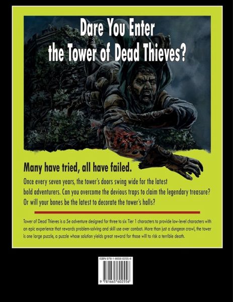 Dare you enter the Tower of Dead Thieves? Many have tried, all have failed. Once every seven years, the tower's doors swing wide for the latest bold adventurers. Can you overcome the devious traps to claim the legendary treasure? Or will your bones be the latest to decorate the tower's halls? Tower of Dead Thieves is a 5e adventure designed for three to six Tier 1 characters to provide low-level characters with an epic experience that rewards problem-solving and skill use over combat. More than just a dungeon crawl, the tower is one large puzzle, a puzzle whose solution yields great reward for those willing to risk a terrible death.