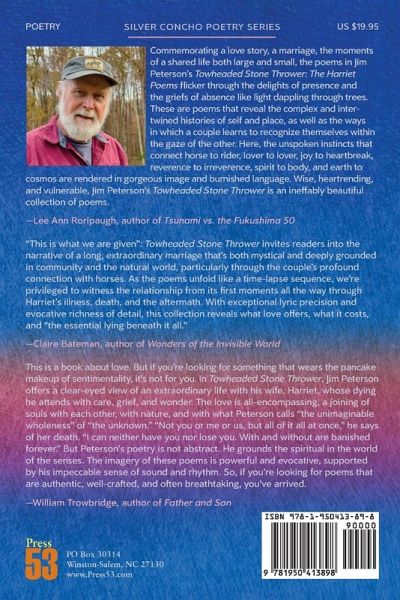 Commemorating a love story, a marriage, the moments of a shared life both large and small, the poems in Jim Peterson's Towheaded Stone Thrower: The Harriet Poems flicker through the delights of presence and the griefs of absence like light dappling through trees. These are poems that reveal the complex and intertwined histories of self and place, as well as the ways in which a couple learns to recognize themselves within the gaze of the other. (Lee Ann Roripaugh)