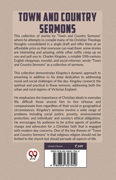 This collection of stories by "Town and Country Sermons" where he attempts to compile many of his Christian Theology thoughts consolidated in a single draft and offer them at an affordable price so that everyone can read them. some stories are interesting and amazing, while other softly creep up on you and pull you in. Charles Kingsley, a notable 19th-century English clergyman, novelist, and social reformer, wrote "Town and Country Sermons" as a collection of sermons. This collection demonstrates Kingsley's dynamic approach to preaching in addition to his deep dedication to addressing moral and social challenges of the day. Kingsley connects the spiritual and practical in these sermons, addressing both the urban and rural regions of Victorian England. He emphasizes the importance of Christian ideals in everyday life, difficult those around him to live virtuous and compassionate lives regardless of their social or geographical circumstances. Kingsley's sermons involve a wide range of problems including social justice, poverty, environmental protection, and individuals' and society's ethical obligations. He encourages his audience to be active agents of positive change and advocates for a Christian faith that is engaged with modern-day concerns. One of the key themes of "Town and Country Sermons" is that religious religion should not be limited to the church but should pervade all aspects of life.