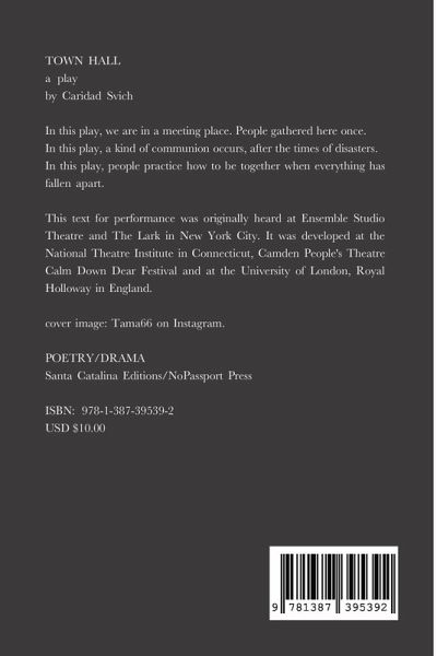 TOWN HALL. a play by Caridad Svich. In this play, we are in a meeting room, a gathering place, a space for communion after many disasters. This space will hold us, some say, if we let it. A story about being together when everything falls apart. This is a Santa Catalina Editions book, an imprint of NoPassport Press.
