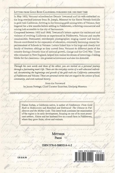 Letters written between 1852 and 1868, vividly describe the overland journey and excitement of settling in the evolving California mining towns of Fiddletown and Volcano in the Sierra Nevada foothills. A native of Vermont, Dennis Townsend marveled at the wonders of California, writing about changes in Fiddletown as it transitioned from its rough and violent beginnings to a more stable community. A man of many talents, Dennis Townsend contributed to the educational and musical development of the region. Letters link him to his large and closely-knit family of fourteen siblings as they migrated from Vermont to the Midwest and South during a frenetic time of national growth, change and the Civil War. Family remaining in New England helped him realize his dream of inventing Townsend's Folding Globe for the classroom. The book spans a tumultuous and fertile period in the U.S., conveying local, state, and national tensions and developments.