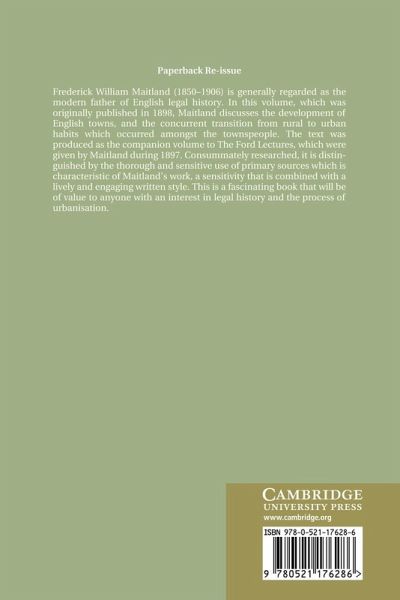 Frederick William Maitland (1850-1906) is generally regarded as the modern father of English legal history. In this volume, which was originally published in 1898, Maitland discusses the development of English towns, and the concurrent transition from rural to urban habits which occurred amongst the townspeople. The text was produced as the companion volume to The Ford Lectures, which were given by Maitland during 1897. Consummately researched, it is distinguished by the thorough and sensitive use of primary sources which is characteristic of Maitland's work, a sensitivity that is combined with a lively and engaging written style. This is a fascinating book that will be of value to anyone with an interest in legal history and the process of urbanisation.