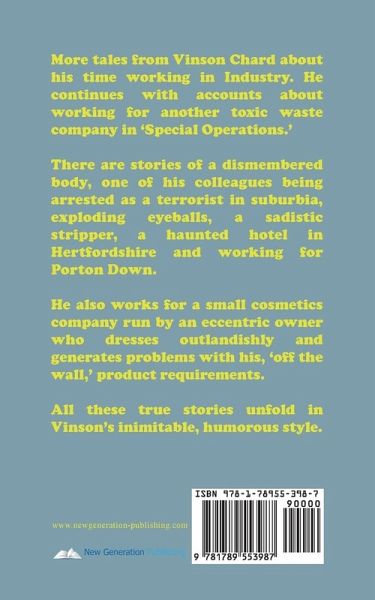 More tales from Vinson Chard about his time working in Industry. He continues with accounts about working for another toxic waste company in 'Special Operations.' There are stories of a dismembered body, one of his colleagues being arrested as a terrorist in suburbia, exploding eyeballs, a sadistic stripper, a haunted hotel in Hertfordshire and working for Porton Down. He also works for a small cosmetics company run by an eccentric owner who dresses outlandishly and generates problems with his, 'off the wall,' product requirements. All these true stories unfold in Vinson's inimitable humorous style.
