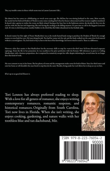 They say trouble comes in threes which seems true in Lauran Lancaster's life... She almost lost her career to a debilitating car wreck seven years ago. She did lose her two-timing husband to the same. Most recently, she nearly lost her beloved Drakón of Thraki to some statue-stealing thief when her house is desecrated and her nearest neighbor murdered. It doesn't take a genius to realize the events are likely related. Staring at her bare face in the bathroom mirror, she decides the first two she can live with, but the last isn't happening. She isn't having the stealing or the killing anymore. It's past time to call in the big guns Lancaster style. It's time to dial that private number hidden in the thick blue file folder abandoned on her bedside table. It doesn't matter her first sight of Frazer MacKechnie was as the tousle-haired hunk trying to purchase the Drakón of Thraki for enough money to cross both her eyes. He's just doing his job. Too bad her statue isn't for sale and the hunk walked out the same door he'd entered without a second glance. Yes, he'd tried to buy it; but to the best of her knowledge, he'd never tried to steal it. There is a difference. However, what does matter is that MacKechnie has the necessary skills to stop her want-to-be-thief since he'd once thwarted corporate espionage. From the file in her possession, he was excellent at his prior profession with the Fortune 500 references to prove it. Calling MacKechnie with a business proposition, she is surprised he tentatively accepts her offer despite informing her several times he no longer does that kind of work. He even consents to stay in her home. She has plenty of room and the arrangement makes sense for both of them. Since her thief enters and exits her home at will shouldn't the man hired to stop him do the same? Besides, living under her roof allows her to keep an eye on him. If he's up to no good she'll know it.