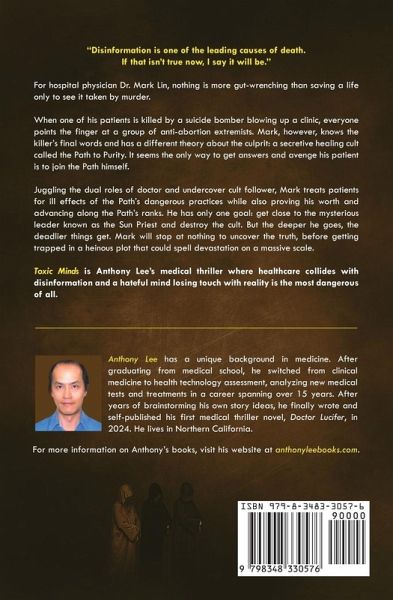 "Disinformation is one of the leading causes of death. If that isn't true now, I say it will be." For hospital physician Dr. Mark Lin, nothing is more gut-wrenching than saving a life only to see it taken by murder.When one of his patients is killed by a suicide bomber blowing up a clinic, everyone points the finger at a group of anti-abortion extremists. Mark, however, knows the killer's final words and has a different theory about the culprit: a secretive healing cult called the Path to Purity. It seems the only way to get answers and avenge his patient is to join the Path himself.Juggling the dual roles of doctor and undercover cult follower, Mark treats patients for ill effects of the Path's dangerous practices while also proving his worth and advancing along the Path's ranks. He has only one goal: get close to the mysterious leader known as the Sun Priest and destroy the cult. But the deeper he goes, the deadlier things get. Mark will stop at nothing to uncover the truth, before getting trapped in a heinous plot that could spell devastation on a massive scale.Toxic Minds is Anthony Lee's medical thriller where healthcare collides with disinformation and a hateful mind losing touch with reality is the most dangerous of all.