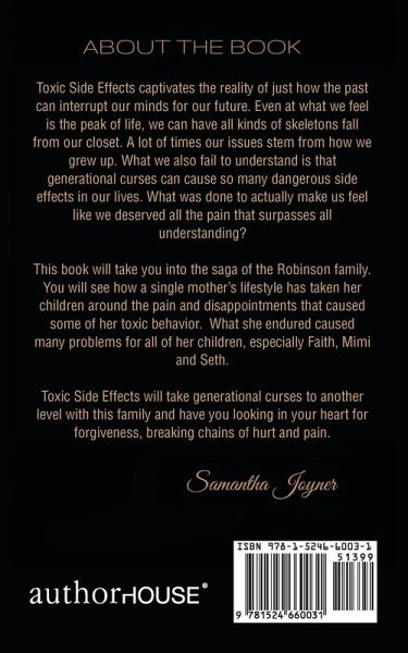 Toxic Side Effects captivates the reality of just how the past can interrupt our minds for our future. Even at what we feel is the peak of life, we can have all kinds of skeletons fall from our closet. A lot of times our issues stem from how we grew up. What we also fail to understand is that generational curses can cause so many dangerous side effects in our lives. What was done to actually make us feel like we deserved all the pain that surpasses all understanding? This book will take you into the saga of the Robinson family. You will see how a single mother’s lifestyle has taken her children around the pain and disappointments that caused some of her toxic behavior. What she endured caused many problems for all of her children, especially Faith, Mimi and Seth. Toxic Side Effects will take generational curses to another level with this family and have you looking in your heart for forgiveness, breaking chains of hurt and pain.
