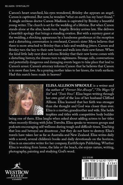 Carson's heart searched, his eyes wondered, Brinley she appears an angel. Carson is captivated. But now, he wonders "what on earth has my heart found." A single ambious doctor Carson Madison is capivated by Brinley a beautiful young writer. The church is set for the wedding of a lifetime. But when Carson stands alone at the altar, heads turn. Angelic Brinley arrives late. She delivers a heartfelt apology that brings a standing ovation. But with a mystery guest at the wedding, a shocking appearance by a handsome gentleman at the reception and a disturbing conversation is overheard, Carson's sister Myra believes that there is more attached to Brinley than a halo and wedding jitters. Carson and Brinley turn the key to their new home and walk into their new future. When the kind little lady next door informs Brinley that their new home comes with a disturbing history, the dreams turn to nightmares. Strange calls, conversations and potentially dangerous and damaging events began to take place that lead to Carson's arrest. Carson's attorney informs Carson that he believes that Carson is in more than love. As a praying mother takes to her knees, the truth surfaces. Had this match been made in heaven?