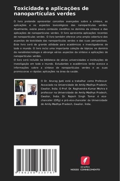O livro pretende apresentar conceitos avançados sobre a síntese, as aplicações e os aspectos toxicológicos das nanopartículas verdes. Atualmente, existe pouco conteúdo científico no domínio da síntese e das aplicações de nanopartículas verdes. O livro apresenta aplicações recentes de nanopartículas verdes. O livro também oferece uma ampla cobertura dos aspectos de toxicidade das nanopartículas verdes e das suas perspectivas. Este livro será de grande utilidade para académicos e investigadores de todo o mundo. O livro inclui uma importante coleção de tópicos no domínio da nanobiotecnologia e abrange vários aspectos da síntese e aplicações de nanopartículas verdes.O livro será incluído na biblioteca de várias universidades e instituições de investigação em todo o mundo. Estudantes e académicos terão acesso a informações sobre a síntese de nanopartículas verdes e as suas promissoras e rápidas aplicações na área da saúde.