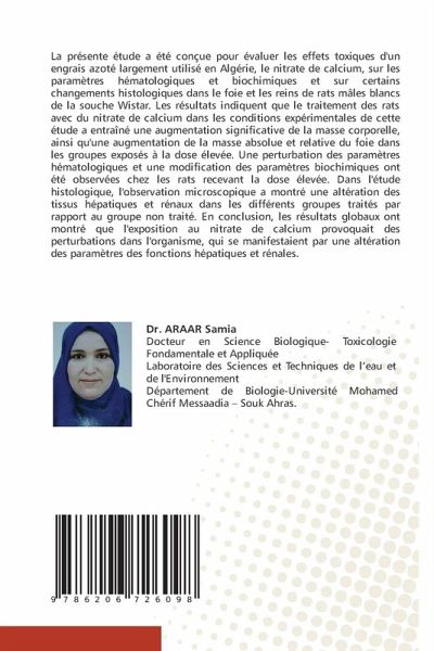 La présente étude a été conçue pour évaluer les effets toxiques d'un engrais azoté largement utilisé en Algérie, le nitrate de calcium, sur les paramètres hématologiques et biochimiques et sur certains changements histologiques dans le foie et les reins de rats mâles blancs de la souche Wistar. Les résultats indiquent que le traitement des rats avec du nitrate de calcium dans les conditions expérimentales de cette étude a entraîné une augmentation significative de la masse corporelle, ainsi qu'une augmentation de la masse absolue et relative du foie dans les groupes exposés à la dose élevée. Une perturbation des paramètres hématologiques et une modification des paramètres biochimiques ont été observées chez les rats recevant la dose élevée. Dans l'étude histologique, l'observation microscopique a montré une altération des tissus hépatiques et rénaux dans les différents groupes traités par rapport au groupe non traité. En conclusion, les résultats globaux ont montré que l'exposition au nitrate de calcium provoquait des perturbations dans l'organisme, qui se manifestaient par une altération des paramètres des fonctions hépatiques et rénales.