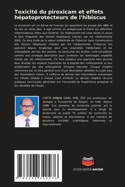 Le piroxicam est un dérivé de l'oxicam qui appartient au groupe des AINS et qui est en vente libre. Il agit comme un analgésique et freine les affections inflammatoires telles que l'arthrite. Ce médicament est sans doute la cause la plus fréquente des lésions hépatiques induites par les médicaments (DILI). Ce livre traite de la valeur médicinale de l'hibiscus dans l'amélioration des lésions hépatiques induites par les médicaments. L'hibiscus est apprécié depuis longtemps pour ses propriétés médicinales et les antioxydants dérivés des plantes, en particulier les feuilles, sont considérés comme une stratégie alternative pour améliorer les dommages oxydatifs induits par les médicaments. Ce livre propose une approche bien pensée pour élucider les aspects importants de la toxicité des médicaments et leur amélioration par des antioxydants d'origine naturelle. Chaque chapitre commence par un titre général suivi d'une description détaillée du sujet avec des illustrations claires. Il s'efforce de donner des informations actualisées sur l'étude relative à chaque sujet d'intérêt. Le dernier chapitre résume quelques conclusions générales sur l'ensemble de l'expérience préparée et les résultats de l'étude.