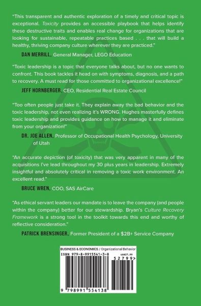 As an author and speaker, Dr. Bryan C. Hughes provides thought leadership and research insights around culture recovery, toxic leadership, ethical leadership, organizational integrity, and associate retention. His extensive success in building and scaling impactful organizations is matched by his expertise in driving clear communication on strategy and operations, and human capital development. Bryan has a proven track record of leading high-performance teams, strengthening company culture, and fostering enhanced financial performance, YOY revenue growth, and net profit increases. He now works directly with organizations to support sustainable growth and performance through increasing leadership capacity, and on-purpose execution.Bryan has nearly three decades of practical experience, with two decades in executive leadership roles. He has seen every business model and worked in several capacities, including consulting and advising organizations in every North American time zone. Through his experience, Bryan has seen the pervasive toxicity that many companies struggle to remove, and has made it his goal to help them tackle and solve this problem. Through the academic research and practical application, he found that operational tweaks could result in minor improvements but rarely led to sustainable growth or significant change. The main blocker of operational excellence was often deeper, embedded in leadership styles and organizational culture. The result of his doctoral research created a research-backed and peer-reviewed framework-the Culture Recovery Framework outlined in this book-to heal pervasive toxicity in organizations and ultimately increase associate retention. For the past several years, Bryan has tested this framework in companies across America, successfully helping his clients heal their culture and remove toxicity.If you would like to work with Bryan to help your organization solve for associate retention and create an ethical culture, you can contact him at bryan@cleardaystrategies.com.