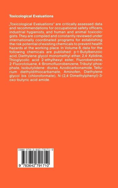 As part of its "Programme for the prevention of health haz ards caused by industrial substances", the Berufsgenossen schaft der chemischen Industrie (BG Chemie, Employment Accident Insurance Fund of the Chemical Industry) began in 1977 to investigate the toxicity of those chemicals which are widely used, have many different applications and are suspected of being dangerous to health, in particular of hav ing long-term effects. The investigations consist of a litera ture search and - depending on the results - commissions of experimental studies. It is hoped by means of this testing to close gaps in our knowledge and to increase the scientif ic validity of the required risk assessments. The results of the toxicological investigations carried out by BG Chemie, and the resulting substance assessments have been published in German since 1987 in the form of 169 "Toxikologische Bewertungen" ("Toxicological Evaluations") up to now. In order to make this useful information internationally available, BG Chemie began in October 1990 to publish as a book series in English, of which the eighth volu them me (containing 14 individual evaluations) is presented here. Therefore for 110 existing chemicals "Toxicological Evalua tions" are available in English at the moment, a further 54 are in preparation and will be published soon.