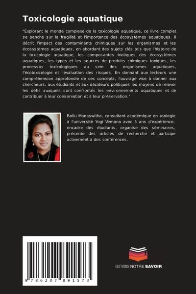 "Explorant le monde complexe de la toxicologie aquatique, ce livre complet se penche sur la fragilité et l'importance des écosystèmes aquatiques. Il décrit l'impact des contaminants chimiques sur les organismes et les écosystèmes aquatiques, en abordant des sujets clés tels que l'histoire de la toxicologie aquatique, les composantes biotiques des écosystèmes aquatiques, les types et les sources de produits chimiques toxiques, les processus toxicologiques au sein des organismes aquatiques, l'écotoxicologie et l'évaluation des risques. En donnant aux lecteurs une compréhension approfondie de ces concepts, l'ouvrage vise à donner aux chercheurs, aux étudiants et aux décideurs politiques les moyens de relever les défis auxquels sont confrontés les environnements aquatiques et de contribuer à leur conservation et à leur préservation."