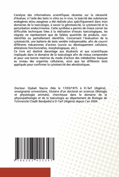 L¿analyse des informations scientifiques récentes sur la nécessité d¿évaluer, à l¿aide des tests in vitro ou in vivo, la toxicité des substances endogènes et/ou exogènes a été réalisée plus spécifiquement dans trois domaines de la toxicologie, à savoir la génotoxicité, la cytotoxicité et la perturbation endocrinienne. Cette synthèse a permis de mieux cerner les difficultés techniques liées à la réalisation d¿essais toxicologiques, les migrats ne représentant que de faibles quantités de produits, non-identifiés ou partiellement identifiés. Concernant l¿évaluation de la cytotoxicité, une batterie de tests semble indispensable, afin de couvrir différents mécanismes d¿action (survie ou développement cellulaire, altérations fonctionnelles, morphologiques, etc.). Ce livre est destiné davantage aux étudiants et aux scientifiques impliqués dans le domaine de la toxicologie afin de mieux comprendre et pour une bonne maitrise du mode d¿action des métabolites toxiques au niveau des organites cellulaires, ainsi que les différents tests appliqués pour confirmer la cytotoxicité des xénobiotiques.